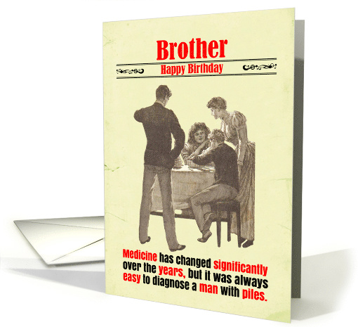 Humorous card for brother with an original Victorian drawing of a man standing erect beside a dinner table. Caption reads: 'Medicine has changed significantly over the years, but it has always been easy to diagnose a man with piles.'' Please Note: The edges of this design are intentionally designed to look torn and aged.'