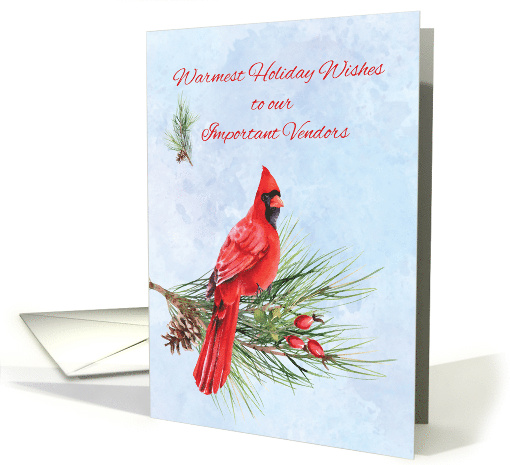 Impress your vendors with this stunning card depicting a red cardinal amidst red berries on a pine branch in the snow. Express gratitude for their support and offer festive greetings.