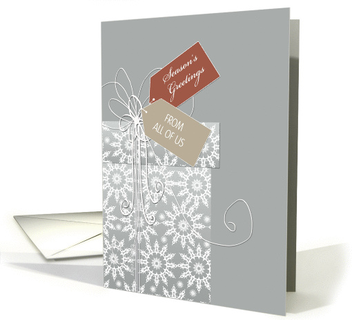 Send stylish Christmas wishes "from all of us" with this contemporary card.This elegant business Christmas card features a present or gift (wrapped in grey gift wrap paper covered with white snowflakes) a white swirly ribbon and tags. You can edit text inside card yourself.