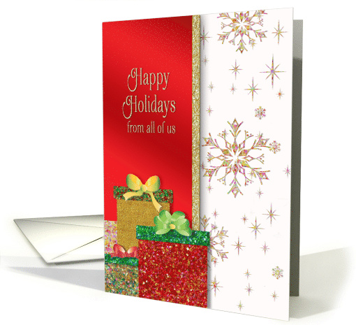 Fun and unique Christmas greeting with glitzy faux presents and ribbons and large snowflakes on the opposite side of this split overlap. Text on the front is, from all of us. Place your company['s name on the inside below verse. Other categories will be available with the same/similar design Note: The image has been designed digitally does not print using metallic ink. The card does not come with actual glitter and all effects are digital reproductions See other categories with the same/similar image