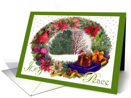 something festive & cheerful for your customer, classic holiday artwork with christmas greeting in colorful swirly fonts from your business, original cozy winter scene by judith cheng