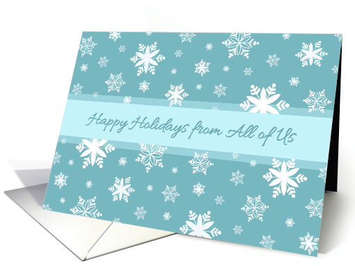 Happy holidays business from all of us card, modern and contemporary in white and teal blue with elegant snowflakes pattern.