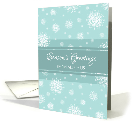 Season's greetings business from all of us Christmas card, modern and contemporary in elegant teal and white snowflakes pattern.