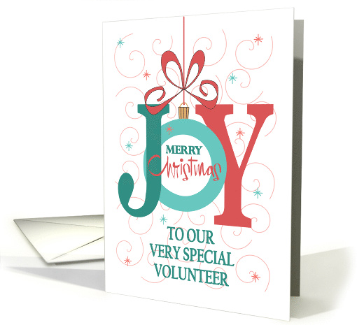 This lovely Christmas ornament holiday thank you card for your school volunteers is the perfect way to wish each of them a Happy Holiday and thank them for their service to your school or schools. Also perfect for teachers to give to each of the parent volunteers who assist in their classroom, a large Christmas ornament fills the center of the white card, within the large word "JOY". The letter "O" is a round ornament with hand lettered wording of "Merry Christmas" written along the side, with wording below that says "To our very special Volunteer". Twinkles of green and red brighten the white background with holiday festivity. The card's inside wording says "Thank you for your giving and caring spirit that warms the hearts of our children. Wishing you very Happy Holidays."