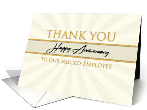 A general employee anniversary card in cream and black and gold. Acknowledge an employee's dedication and hard work and convey your gratitude with this elegant card.The card front has a large "Thank you to our valued employee" in a gold effect with "Happy Anniversary" in elegant handwritten black letters. Does not print in metallic ink, digital effects. Excellent for corporate use. Celebrate this milestone with your employee. Please note that the gold does not print in metallic ink.Design ©PamJArts Design