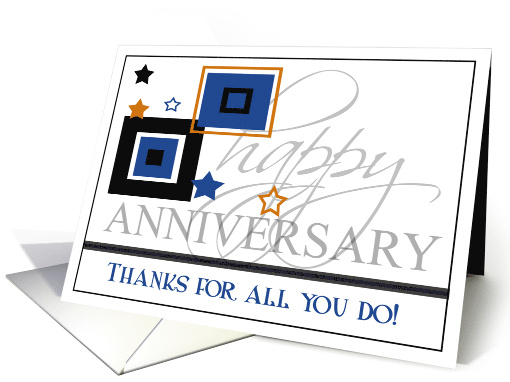 A simple business card with light gray script that reads "Happy Anniversary" and text below that reads "thanks for all you do!" various stars and boxes adorn the upper left in gold, blue and black colors.