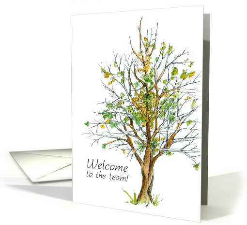 A welcome to the team business greeting card for a new employee decorated with an autumn tree with changing leaves drawn in black pen and ink with watercolor. Nice card to welcome a new employee!