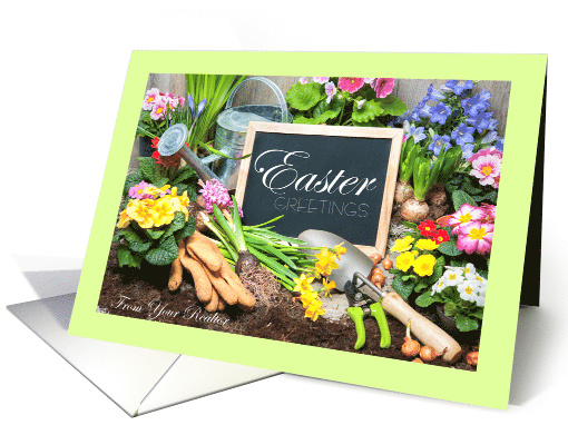 Cheerful Easter card from Realtor has beautiful spring plants and gardening tools in bright colors, and "Easter Greetings" written on chalkboard.