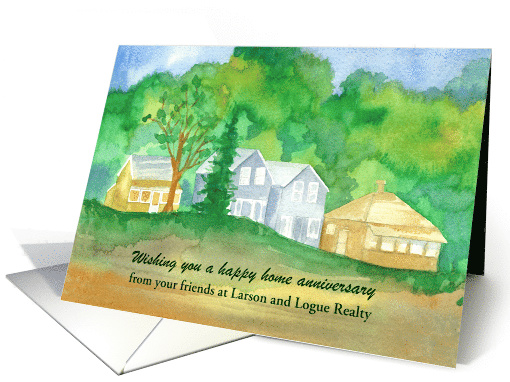 Happy First Home Anniversary wishes from a realtor to new home owners featuring coastal cottages in shades of weathered grey and sand tucked in thick trees with a calm blue sky above.