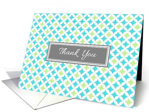 Fun and bright business thank you card with retro geometric pattern in modern turquoise blue, white, lime green, and grey.