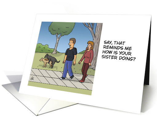 Humorous Adult Blank Note Card with a cartoon showing a couple walking by a park where two dogs are having sex. He sees them and comments. The words say: Say that reminds me, how is your sister doing? Inside is blank