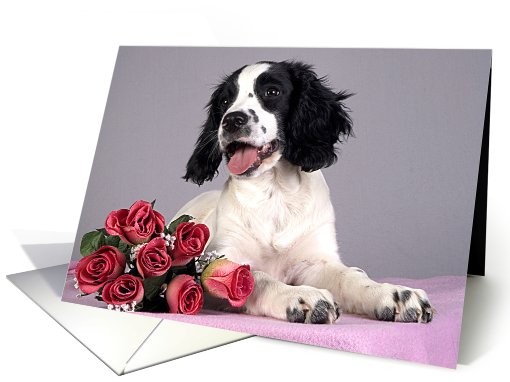 You can add inside personalization if you wish - or contact the artist for more design help. This card features a happy English Springer Spaniel puppy with a bunch of pink roses.