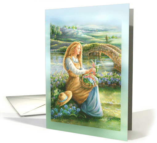 This design is a detail from an original oil painting by artist Ramelle Richardson. The title is "Megan's Morning". A lovely young woman picks flowers as her lover approaches, unknown to her. It's going to be a beautiful day for Megan! This blank card with its feminine and idyllic scenery features a footbridge over a stream and a lovely woman amid a profusion of flowers. Use this for a birthday card, Mother's Day, or any occasion where you would like to have frameable art without text on the front to deter from the image.