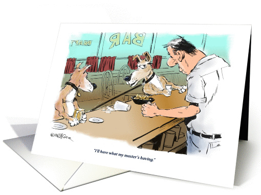 The cartoon shows a dog in a bar, tethered to his master on the floor. This all occasion blank cartoon card always reminds me that my dog can outdrink me anytime.