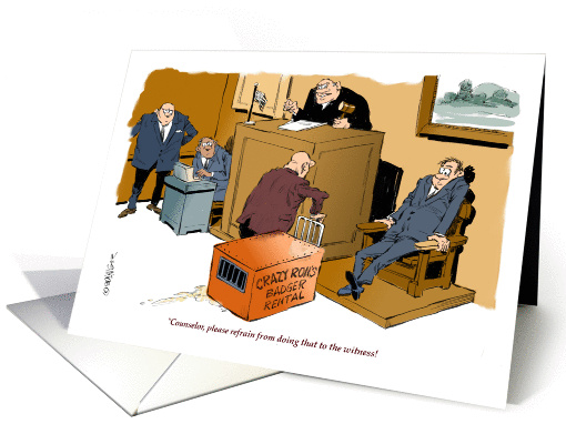 A quality blank any occasion 111 pound cover stock similar to cards you find in museum gift shops. This cartoon scene takes place inside a courtroom where theatrics often take the place of justice. The prosecutor looks like he'd try anything to win!