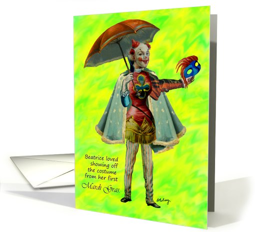 Beatrice and Her Mardi Gras Costume is fourth in the Delusions in an Alternate Reality (DAR) digital collage series by A E Ivey. The inside of the card is blank so you can personalize it.