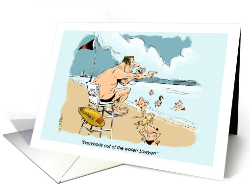 The beach scene shows an alert lifeguard clearing the water when a lawyer is sighted close to shore. Writing out occasion blank cards like this might help pass the time sitting in the sun while you're waiting for the all-clear.