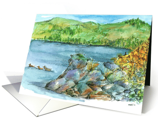 A nature note card featuring four ducks in a calm mountain lake with colorful plants growing in the rocks and tree covered mountains in the distance illustrated with ink and watercolor.