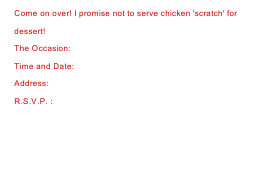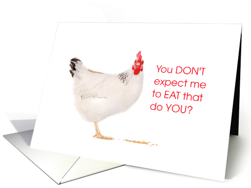 Using humor for a dinner invitation, this chicken is asking a valid question! Fun,humorous dinner invitation that you can customize. Not my photo but it is my humor! Click on my name above for more humorous cards! Cherie's Art Cards