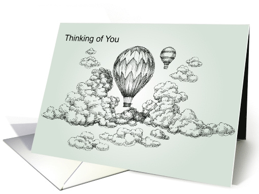 Black and white drawing of hot-air balloons soaring amongst the puffy clouds up in the sky with the words Thinking of You in black lettering in upper left-hand corner of card. Inside verse: Soaring above the clouds. Congratulations!