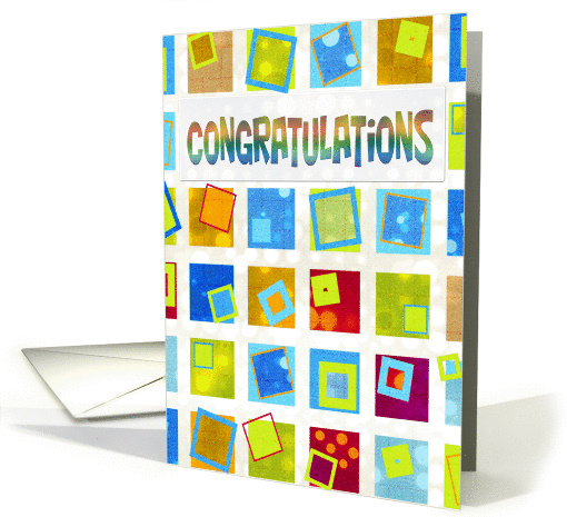A bright colorful and fun geometric - retro style pattern made by using shapes like dots, circles, lines, squares and some plain with bokeh here and there. This design is full of interesting detail and offers a cheerful Congratulations in general to anyone!