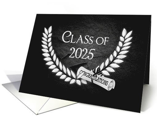 White laurel leaf design with a diploma on black slate rock textured background for 2025 Congratulations for Son's graduation