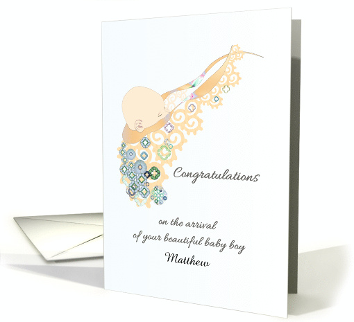 Congratulations on the arrival of a new baby boy. This sketch shows baby asleep, snuggled comfortably in a blanket. The blanket is drawn in an abstract form with colorful motifs and swirls. A soft orange wash is seen along the left edge of the card. This design is customizable for baby's name.