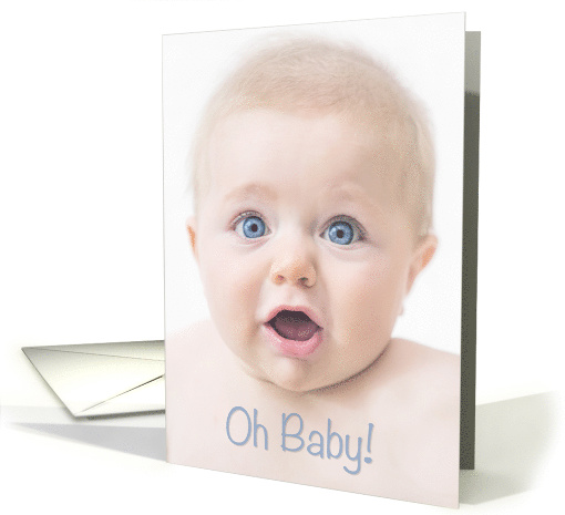 Has someone you know recently added a new member to their family? This is a perfect gender neutral card for new parents or grandparents. Adorable blue eyed baby with a happy, surprised expression.