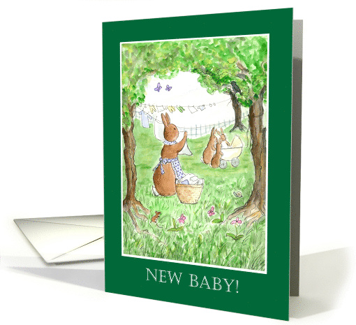 Congratulate the new parents with this cute New Baby Congratulations card that they'll want to keep forever as a memento! The whimsical image is of a rabbit family, with Mother Rabbit hanging out the laundry in the garden, while friends and family members admire the new baby in its pram; from a pen and wash illustration by Judy Adamson. The front cover words, 'NEW BABY!' are in white on the dark green border and you can easily change or delete the inside message to suit the occasion (can also be used as a birth announcement card.)