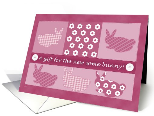 "A New Some Bunny!" A whimsical card to give with your baby shower gift for a baby girl. Inspired by quilting blocks. Please feel free to add to, or change, the inside text to make this card your own.
