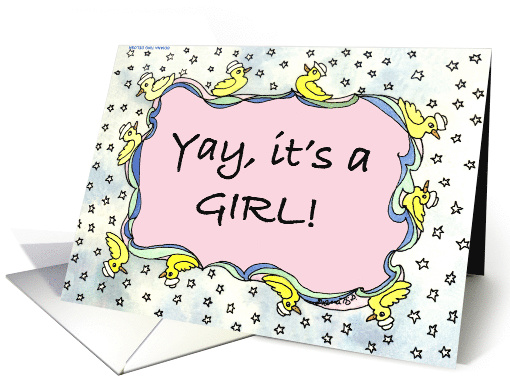 Duckie Yay, it's a girl! © Diana Ting Delosh. Whimsical illustrated border design of ducklings swimming around the joyful words, "Yay, it's a GIRL!" A fun way to congratulate someone on the arrival of their new baby girl.