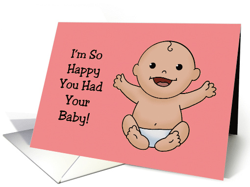 Humorous congratulations card for having a baby girl. The front shows a happy baby on a pink background, and the words, I'm so happy you had your baby! Inside says, I was afraid she would run out of womb! Congratulations!