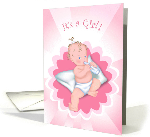 It's a Girl! Baby girl sitting on pillow with bottle of milk digital illustration.