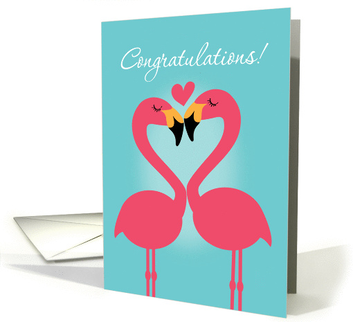 Two female flamingos touching beaks, forming a heart with "Congratulations!" in a script font. South Beach colors of pink and teal. You have the option to add your own sentiments inside.
