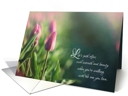 The matted and soft tones of a beautiful tulip along a tulip field pathway is a lovely background to express your best wishes to a couple on their wedding day, as they embark on life's path together. The image is a photograph treated with painterly features to enhance the beauty of the flowers.