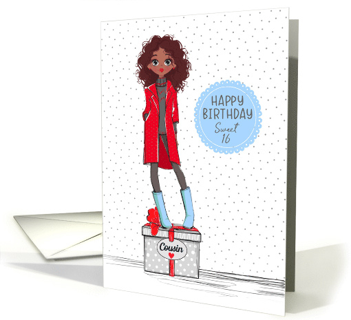 Give your stylish cousin Sweet 16 birthday greetings with this African American teen girl standing on a big present with a fun polka dotted background.