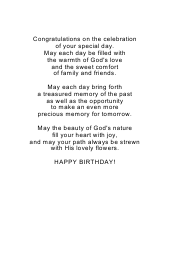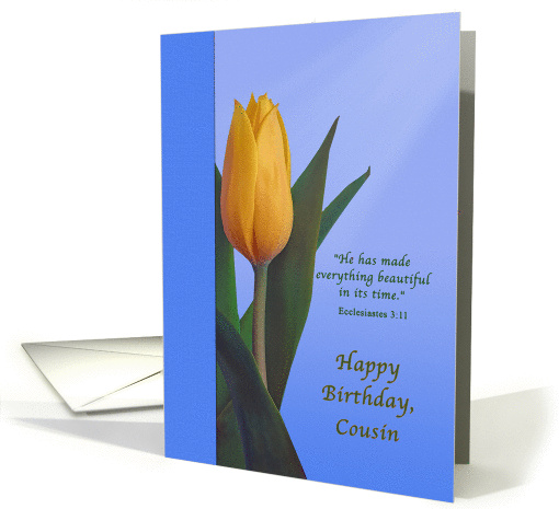 A tulip with golden petals and dark green leaves is the centerpiece of this birthday card for a cousin. Rays of light coming from the upper right of the image bathe the flower in warmth. A border of dark blue on the left side of the card sets off the background of varied blues ranging from light to medium dark. A Bible verse, Ecclesiastes 3:11, in script print is to the right of the flower with the card’s caption underneath the verse.
