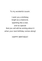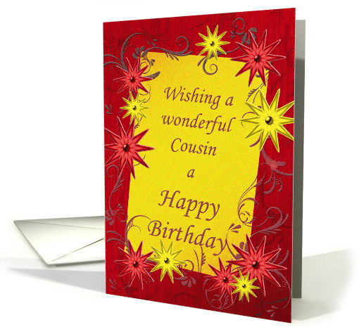 A sparkling bright birthday card with red and yellow stars. A lively card for the young at heart. A lovely birthday card for a cousin.