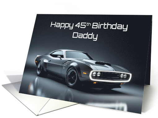 Celebrate Daddy’s 45th birthday with this bold and high-performance birthday card, featuring a modernized classic muscle car in sleek metallic gray. The powerful car, set against a dark, reflective background, is accentuated by futuristic LED lighting and aggressive styling, embodying strength, passion, and speed. The minimalist yet striking typography in crisp white adds a contemporary touch, making the message stand out. Ideal for fathers who love cars, speed, and all things powerful, this card is a perfect way to rev up the excitement and make his special day unforgettable.