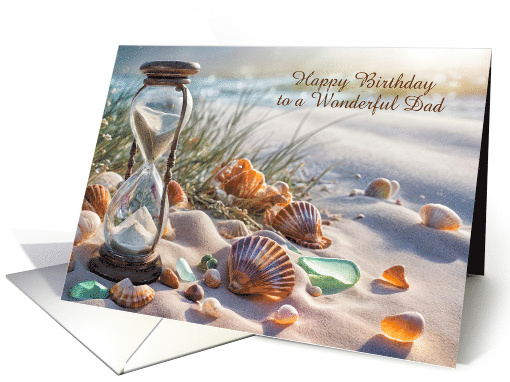 For your dad or father, you can have it read as you like, the font and wording is changeable. A birthday card for a wonderful day, with a coastal beach seaside ocean theme of white sands and a timeless hourglass.