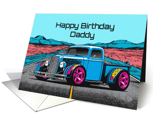 Make Daddy’s birthday extra special with this bold and vibrant car-themed card! Featuring a beautifully illustrated blue vintage pickup truck, this design blends timeless charm with a fresh pop-art twist. The smooth fenders and polished chrome grille radiate classic automotive appeal, while the hot pink rims and geometric fender accents bring playful, modern energy. The scenic desert highway, with fiery red sands and deep blue mountain peaks, symbolizes love, adventure, and the wonderful road of life. Created in a crisp, high-contrast digital style, this card is a fun and heartfelt way to show Daddy just how much he means on his big day.
