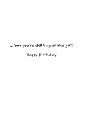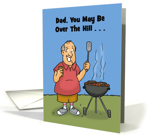 Father's Birthday card with a cartoon showing a man at a BBQ. The words say: Dad, you may be over the hill ... Inside says: ... but you're still king of the grill! Happy Birthday