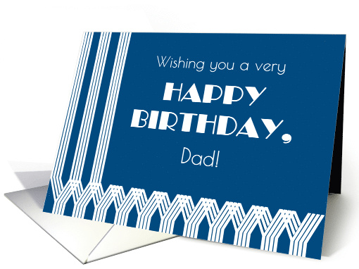 A chic birthday card for your father with Art Deco patterns in white on dark blue, giving it a vintage feel. The front cover greeting, also in Art Deco fonts, is, 'Wishing you a very HAPPY BIRTHDAY, Dad!'. You can easily personalize the inside message.