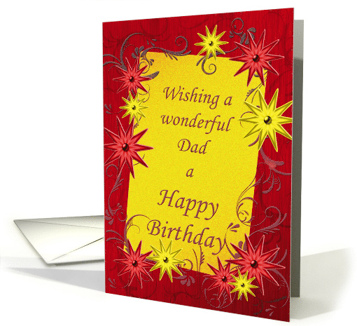 A sparkling bright birthday card with red and yellow stars. A lively card for the young at heart. A lovely birthday card for a dad.