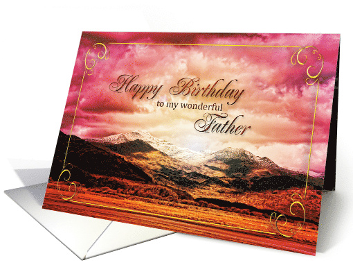 Birthday card for Father with a glorious sunset. The sun is setting behind the mountains with wonderful colors. The view is of Snowdonia in Wales. A wonderful scene to give a smile on his birthday.