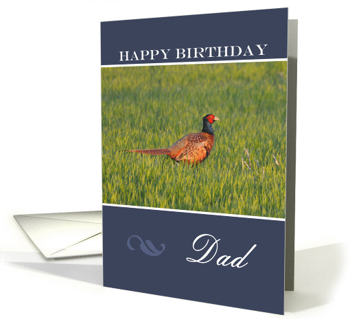 A birthday card for Dad with a photo in the center of a colorful male pheasant in the grass. At the top with a blue background are the words in white "Happy Birthday" and at the bottom with a blue background, the word "Dad".