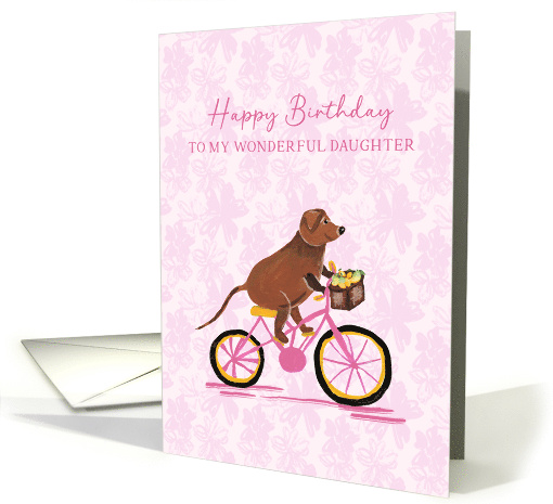Celebrate your daughter’s special day with this playful birthday card featuring a brown dog riding a pink bicycle with a basket full of lemons and mangoes. Set against a soft pink floral background, the cheerful illustration brings joy and whimsy to the occasion. Created in a bold, painterly style using gouache and digital media, it’s perfect for daughters of all ages who love dogs, bright colors, and lighthearted charm. A fun, heartwarming card for a daughter who makes life a joyful ride.