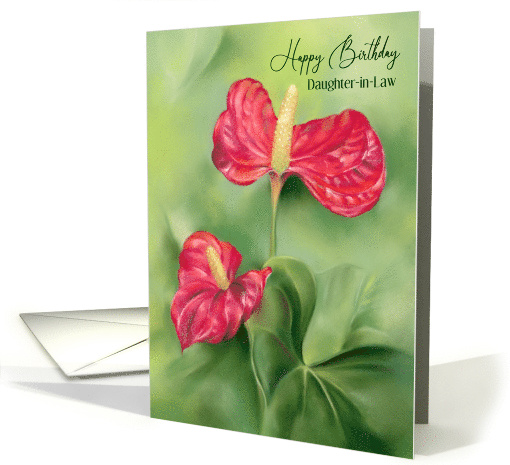 A gorgeous pair of red anthurium flowers with green foliage created in soft pastel tones graces the cover of this birthday greeting along with recipient text that is easily personalized for your daughter-in-law or for anyone.