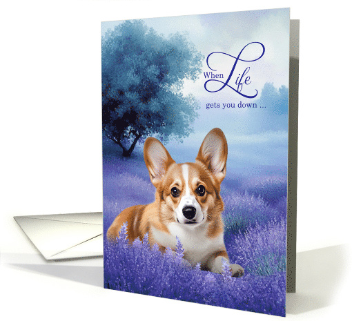 A sweet Pembroke Welsh Corgi dog in a scenic view with a lovely oak tree in deep teal hues and a foggy sky with purple botanical carpet of lavender flowers creates a lovely encouragement card.