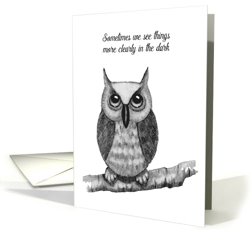 This card features my pencil drawing of a big-eyed owl perched on a branch. Words on the front say, "sometimes we see things more clearly in the dark". Inside there is a little verse offering encouragement to someone going through a tough time.
